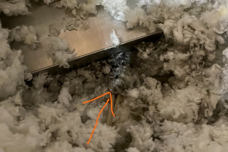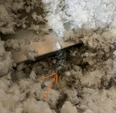 Okay, so I've typed a lot of words to this point and I have not yet gotten to the title topic, airtight recessed can lights. What do these have to do with air sealing, after all they are airtight, correct? Not exactly. While they are certainly much better at preventing air to pass through them than can lights that were used prior to building codes requiring air tight design, they are still not required to be 100% airtight according to ASTM E-283 testing standards. And this is assuming that the installation was perfect. In the picture below, we see part of an air tight can light from the attic side. Notice that the fiberglass blown-in insulation near the lighting housing appears black. This is not mold, this is actually evidence of air leakage. The fiberglass acts as a filter for dusty air that is leaking through the building envelope into the attic. When we see darkened insulation such as this in a location that can be suspected to leak air, it is definitive proof that air is indeed passing across the insulation.