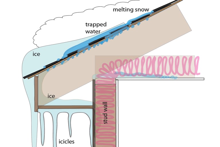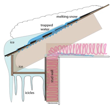 Air sealing is among the most important aspects when creating a robust building system. In fact, building scientists maintain that you should first make sure that you have air sealed before proceeding with the addition of insulation to your attic space. Why is this? Because air flow carries with it a great deal of heat and moisture. Heat and moisture are two things that we definitely don't want entering our unconditioned attic space. The typical vented attic is designed to mimic whatever the outside weather conditions are, and to be completely separated from the environment within your conditioned living space below. Heat and moisture that are able to pass through your ceiling and into your attic can create some major problems beyond the obvious fact that you are losing heat (or cooling) that you have paid for. For example, excess heat entering an attic in a winter that has experienced heavy snow fall such as we are experiencing here in the Fargo-Moorhead area this winter, can cause severe ice damming issues. I sense another blog article to explain exactly why ice dams happen, but the short version is that it occurs when the attic space is warm enough to melt standing snow on a roof. The water then travels down the roof until it hits the eave, where it refreezes. It refreezes at this location because typically the eaves (the overhanging part of the roof) is outside of the exterior wall and will have very cold winter air passing through the vented soffit as part of the attic ventilation. It is not actually the built up ice that creates the problem directly, but rather the melted snow that backs up and can't get past the ice dam, eventually finding a way to seep backwards under the shingles and into the wall cavity.