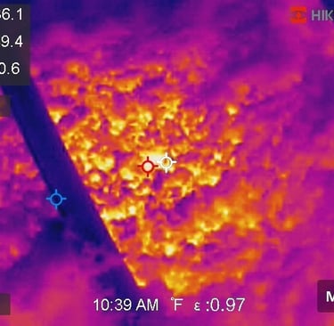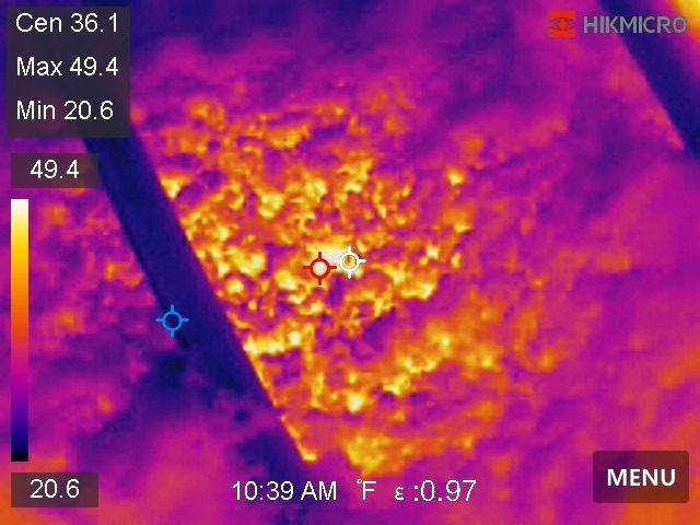 That's about it, but I want to share with you one more picture. Below is from the thermal imaging camera that I used to locate the can light housing in the attic. The temperature of the wood truss is 20.6 degrees, compared to nearly 50 degrees at the hottest surface temperature of the fiberglass blown-in insulation.Even with existing LED bulbs, you can see that there is a significant amount of heat being given off by the lights. Also, since the can light housings are 6-8 inches tall, you do not get as deep of insulation coverage over the top of them. In other words, if your attic insulation depth is 17" throughout the attic, you may only have 9" over the top of each can light. I would suspect that newer LED retrofit trim assemblies like pictured above would give off less heat than older LED bulbs.