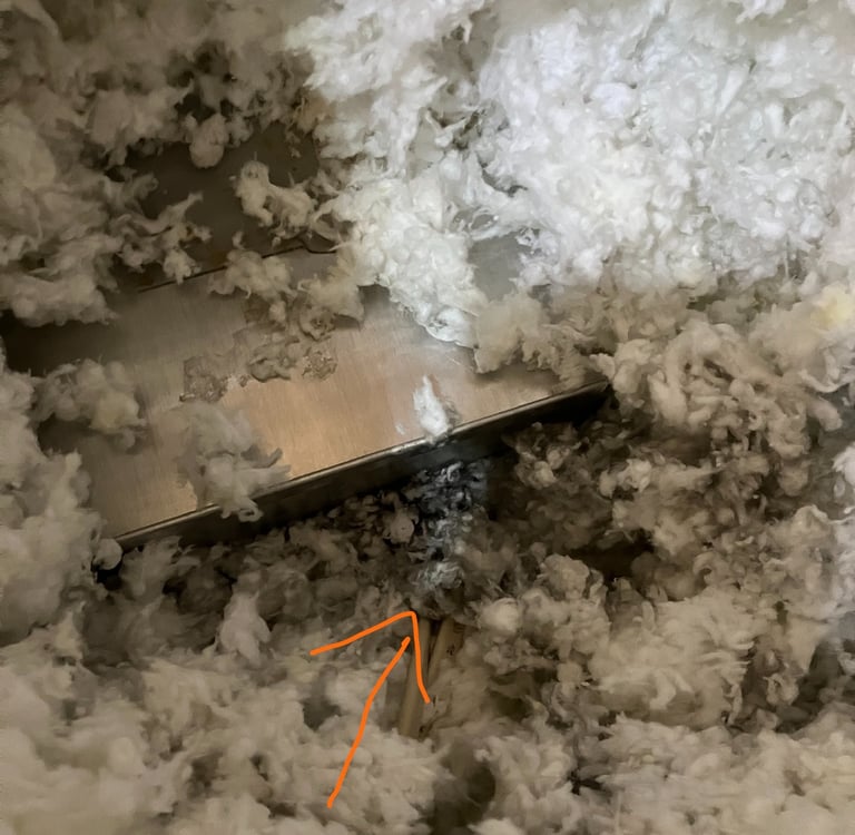 Okay, so I've typed a lot of words to this point and I have not yet gotten to the title topic, airtight recessed can lights. What do these have to do with air sealing, after all they are airtight, correct? Not exactly. While they are certainly much better at preventing air to pass through them than can lights that were used prior to building codes requiring air tight design, they are still not required to be 100% airtight according to ASTM E-283 testing standards. And this is assuming that the installation was perfect. In the picture below, we see part of an air tight can light from the attic side. Notice that the fiberglass blown-in insulation near the lighting housing appears black. This is not mold, this is actually evidence of air leakage. The fiberglass acts as a filter for dusty air that is leaking through the building envelope into the attic. When we see darkened insulation such as this in a location that can be suspected to leak air, it is definitive proof that air is indeed passing across the insulation.