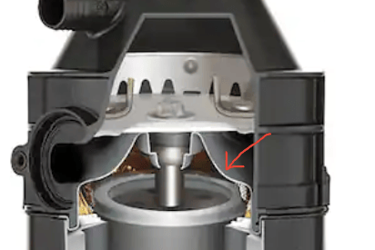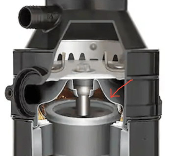 There are certainly multiple ways that a garbage disposals can fail, but I'm going to focus on the end result that has caused me to replace two disposals to this point, and that is that water starts to leak out of the bottom of the unit. The cause in my case appears to have been a rusting through of the lower piece of metal in the area depicted with the red arrow in the illustration below. This is the chamber where the liquified food particles are deposited after being pulverized by the action of the spinning lugs/sidewall grind ring combination above it.